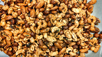 This isn't your average bar snack. A little smoky, a little spicy, and all yummy yummy yummy. The freshly chopped rosemary really brings a great element to these mixed nuts, and helps cut out the saltiness. This takes almost no time at all to create, but tastes to decadent!
